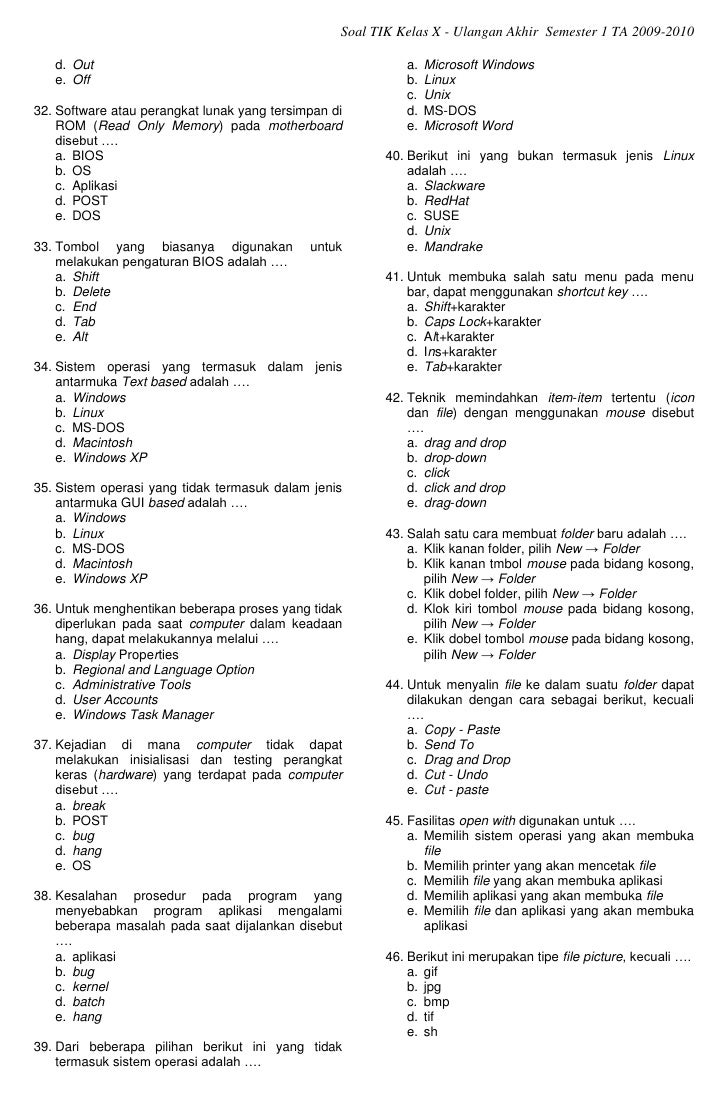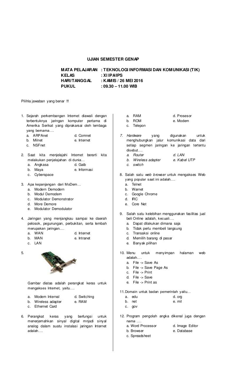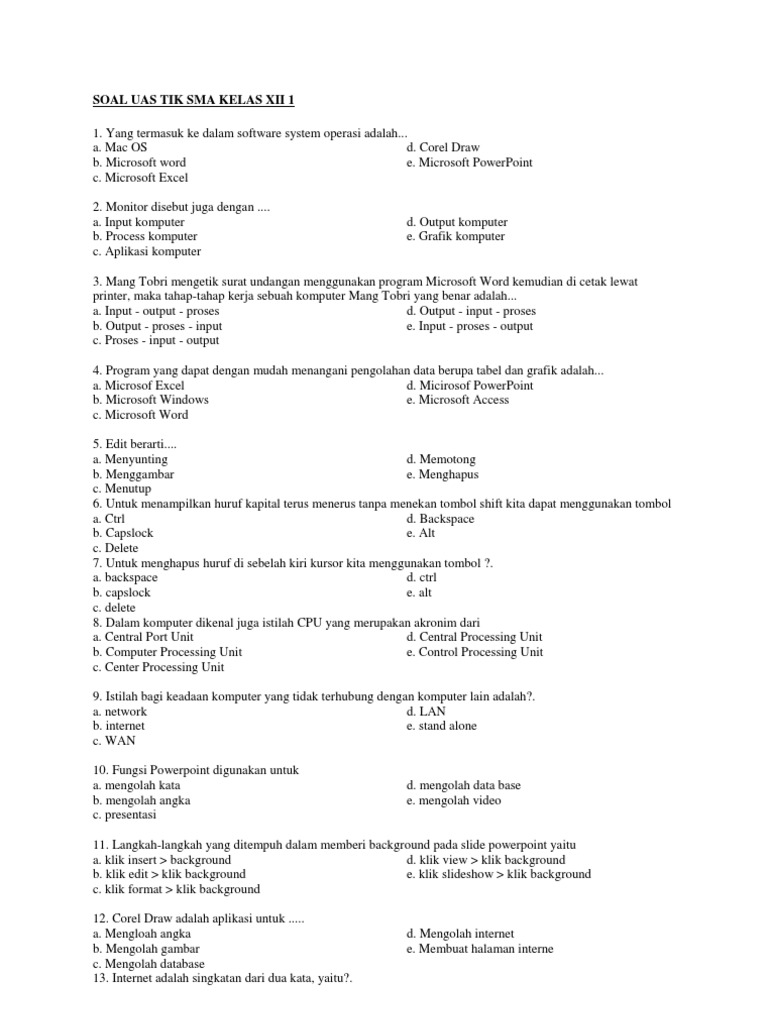 Latihan soal dan jawaban uas pas tik kelas 11 sma ma kurikulum 2013 dapat dijadikan sebagai referensi bagi bapak ibu guru dalam menyusun soal ulangan. Prediksi soal uas dan kunci jawaban. Kumpulan contoh soal uas tik kelas 10 semester 1 dan kunci jawabannya. Soal dan kunci jawaban uas tik semester 1 kelas 10 sma/ma. Sebagian telah dilengkapi dengan kunci jawaban. Silahkan beritahukan kepada kami jika soal tersebut tidak ada kunci jawabannya atau jawabannya salah, maka kami akan dengan cepat mengubahnya kembali. Berikut ini adalah contoh soal dan kunci jawaban ulangan akhir semester (uas) mata pelajaran tik semester 1 (ganjil/gasal) kelas 10 (x) sma/ma kurikulum 2006 (ktsp). Berikut ini adalah contoh soal dan kunci jawaban ulangan akhir semester (uas) mata pelajaran tik semester 1 (ganjil/gasal) kelas 10 (x) sma/ma kurikulum 2006 (ktsp). Materi teknologi informasih,,,, teknologi informasi (tik) salah satu pelajaran yang mengenal sebua perangkat yang terdapat pada kumputer dengan demikian dapat mempermudah unutk.