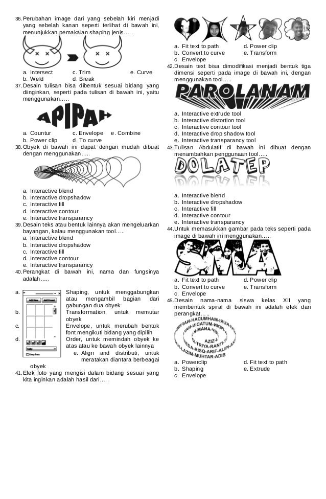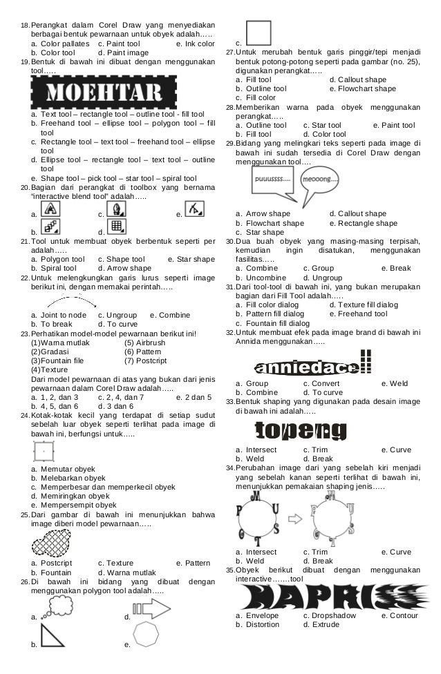 Soal Uas Tik Sma. Kelas 10 , sma , tik , uas , zz. Silahkan beritahukan kepada kami jika soal tersebut tidak ada kunci jawabannya atau jawabannya salah, maka kami akan dengan cepat mengubahnya kembali. Soal uas tik kelas 11 sma/ma ini, adik adik bisa menguduh materi ini di bospedia dalam bentuk file doc. Ketiga aplikasi ini lazim disebut microsoft office, pada dasarnya,aplikasi microsoft powerpoint berfungsi untuk membantu user dalam menyajikan presentasi. Halo sobat semua, pada artikel kali ini saya akan coba share beberapa kumpulan contoh soal uas tik beserta kunci jawabannya. Materi teknologi informasih,,,, teknologi informasi (tik) salah satu pelajaran yang mengenal sebua perangkat yang terdapat pada kumputer dengan demikian dapat mempermudah unutk. Soal ini sudah kakak susun menjadi dua bagian yaitu 40 soal pilihan ganda dan 5 soal essay, dan setiap soal sudah tersedia kunci jawabannya. Perangkat lengkap jenjang sma / smk / ma : Latihan soal dan jawaban uas pas tik kelas 11 sma ma kurikulum 2013 dapat dijadikan sebagai referensi bagi bapak ibu guru dalam menyusun soal ulangan. Soal ini bisa digunakan sebagai bahan latihan dalam menghadapi ujian akhir semester 1 mata pelajaran tik untuk kelas 10 sma/ma. Soal coreldraw (design graphic) soal uas tik sma semester 1 1. Bank soal sma november 27, 2021 16:03. Soal matematika sma kelas x semester 2 100 soal matematika pilihlah selanjutnya. Kisi kisi uas tik smp 20172018 semester 1 kelas 7 8 9 kurikulum. Soal dan kunci jawaban uas tik semester 1 kelas 10 sma/ma.